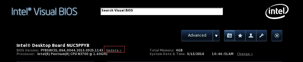 During boot, press F2. An Intel® Visual BIOS screen appears. There is a BIOS Version