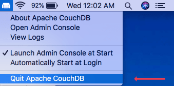 To quit CouchDB, click on the CouchDB icon that appear on the status menu bar and expand the menu. Select Quit Apache CouchDB