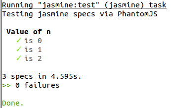 On running the test suite configured in Grunt, the output to the terminal looks like