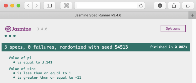 We write the specs in Jasmine (below) to check that the value of π returned by pi()