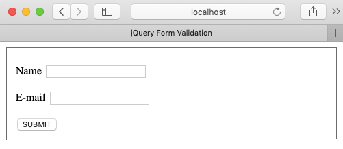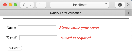 Now, jQuery form validation happens on click of submit. The corresponding error messages show up on click of the submit button if the assigned conditions are unfulfilled